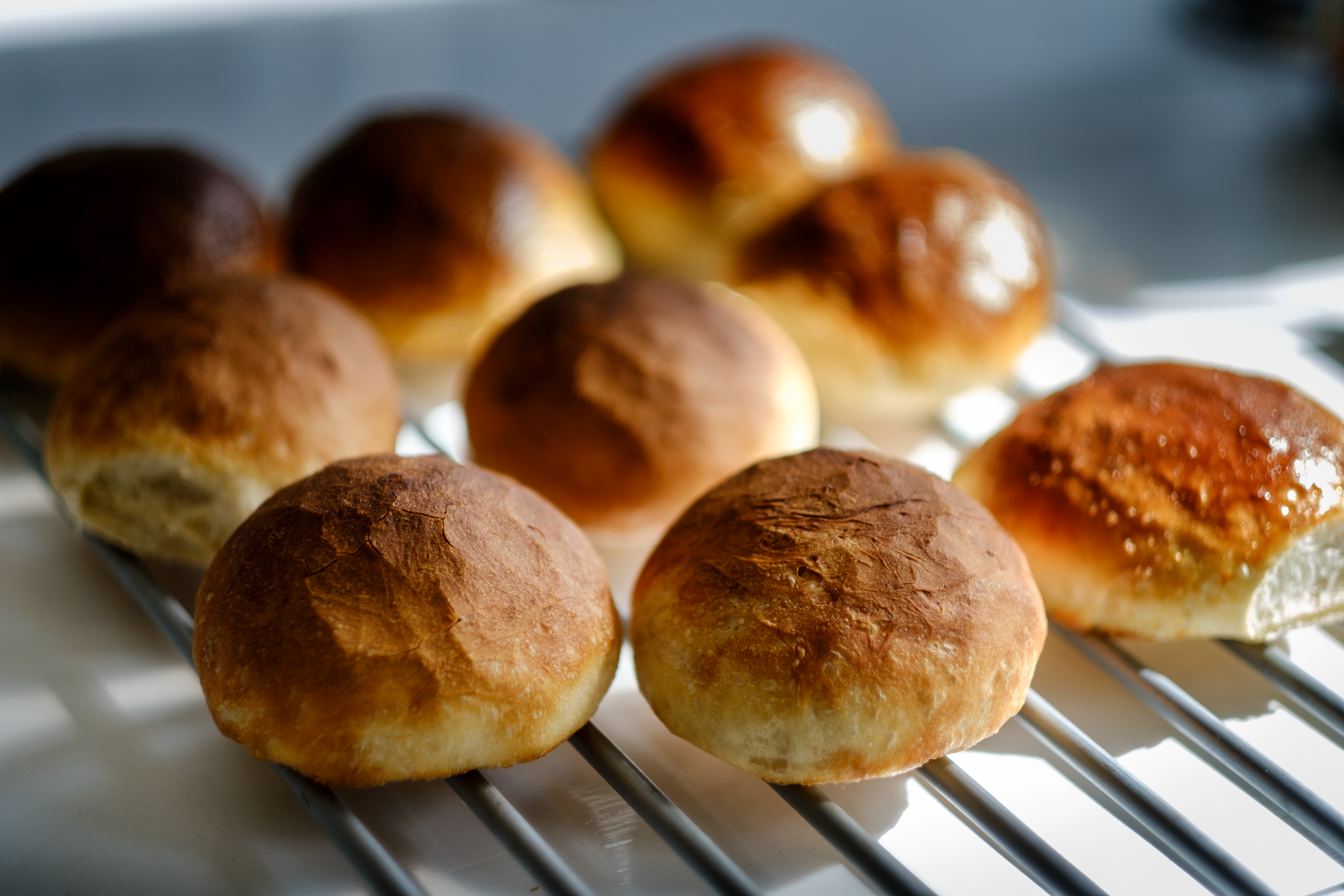 Pensla frallorna med vatten eller mjölk och strö över eventuell topping.
